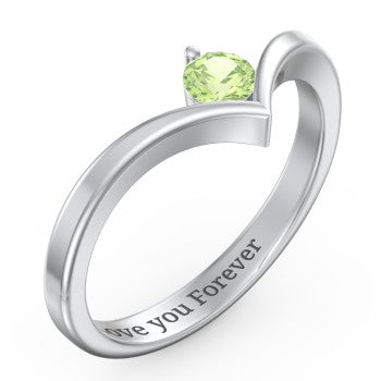 Modern meets chic in this stylized ring design. A beautiful solitaire round-cut birthstone is uniquely set in a V-shaped band. Choose from silver or gold and engrave the inside base of the ring to add a special personal touch.
